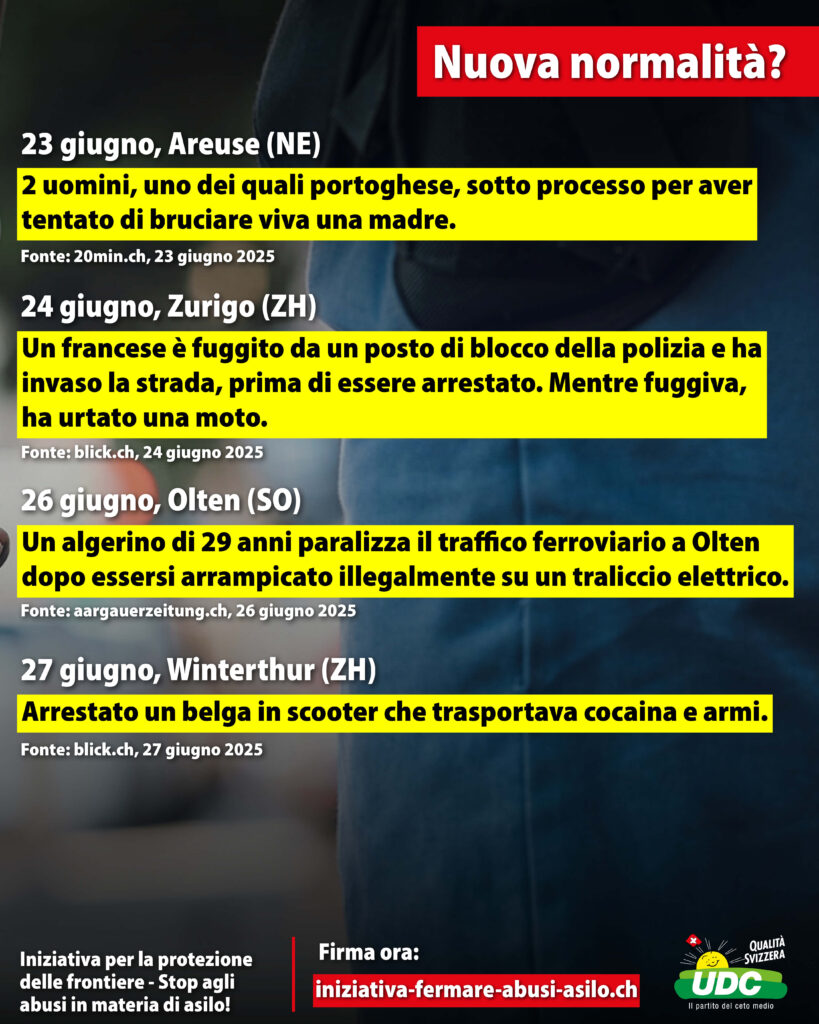 La Svizzera sta diventando sempre meno sicura, a causa di una criminalità importata che approfitta di una politica di immigrazione lassista e di frontiere spalancate. L’UDC è l’unico partito realmente impegnato a contrastare l’immigrazione di massa e a proteggere i nostri confini.